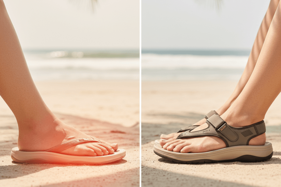• 👎 Thin flip-flops – no support, no protection, easy to trip.